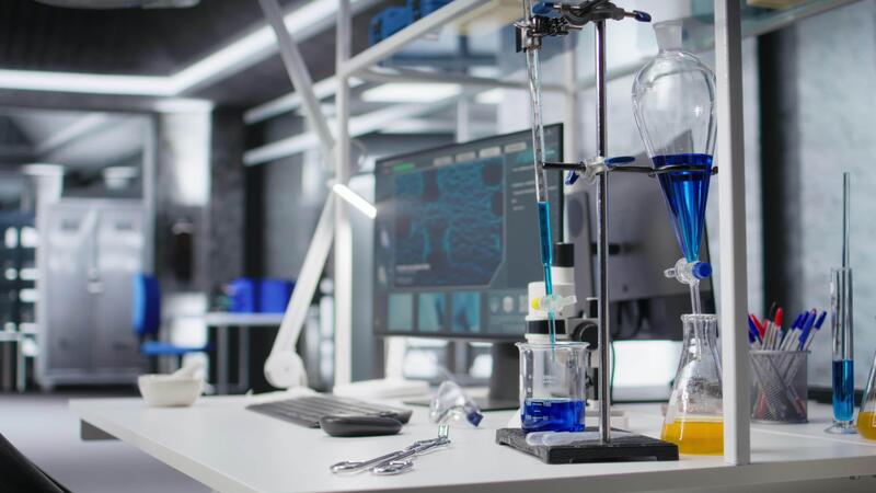 Laboratory tools and blood samples in empty diagnostics lab, scientific environment supports microbiology and biotechnology research. Precision, preparation and advanced clinical testing. Pro Video