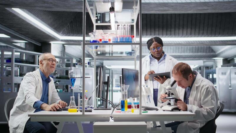 Team of experts investigate molecular samples at microscope with laboratory tray and lens system, magnification tools support diagnostics and biotechnology breakthrough in science. Camera A. Pro Video