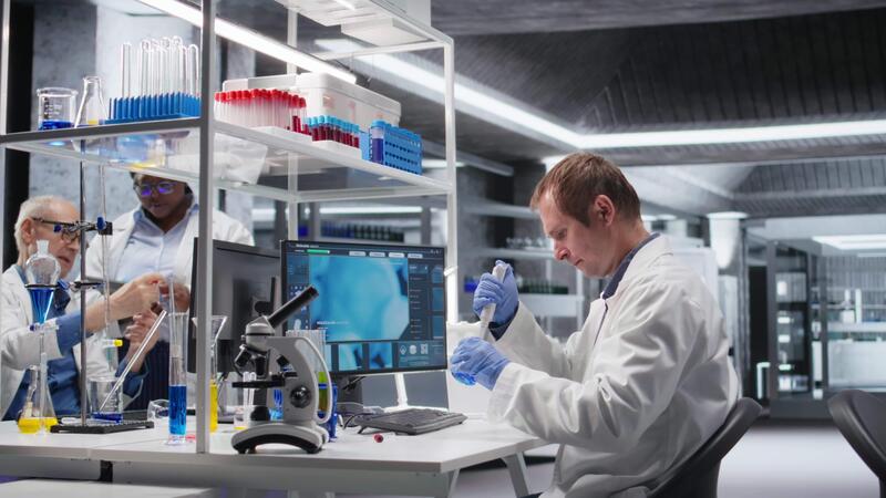 Male scientist handles pipette with droplet over jar during procedure in the lab. Mixture preparation supporting genetics research, nanotechnology and solutions through analytical methods. Camera A. Pro Video