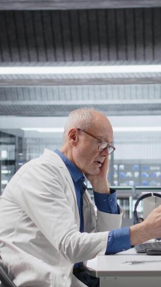 Vertical Chemist in biolab observes computer with fascination and curiosity, captivating experiment data results. Intrigued scientist reading unusual biotechnology research discovery. Camera A. Pro Video
