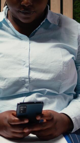 Vertical Relaxed female applicant browses phone in hallway lineup and waiting, repeating her speech to present her qualifications and experience on the CV. Preparing for the selection process. Camera A. Pro Video