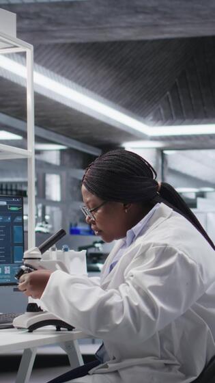 Vertical Black scientist examining samples under microscope in a modern laboratory. Research work integrates biotechnology, molecular science and advanced diagnostics to shape medical discovery. Camera A. Pro Video