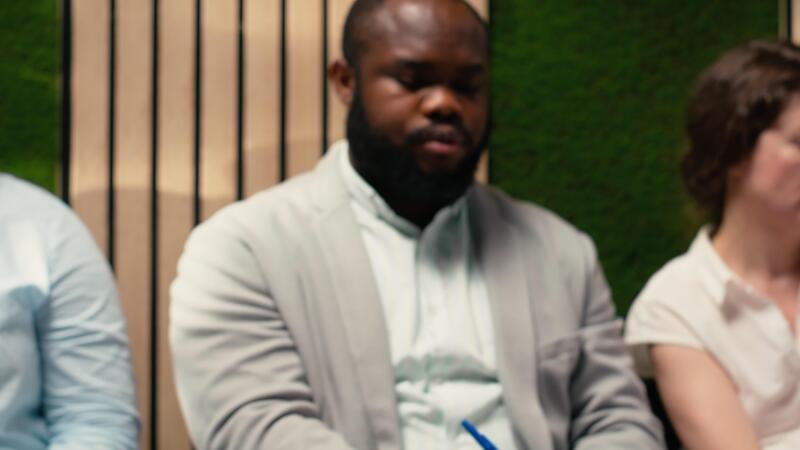 Three job seekers waiting in the hallway with documents and resumes, preparing for a formal interview with the HR team. Applicants getting impatient in the queue on the corridor. Camera B. Pro Video