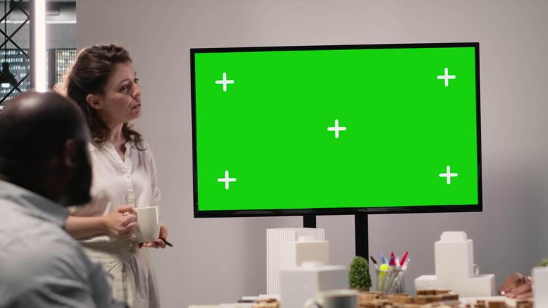 Diverse team exploring zoning regulations next to isolated display, meeting for city planning strategies with architectural 3D models and design tools for site preparation and development. Camera B. Pro Video