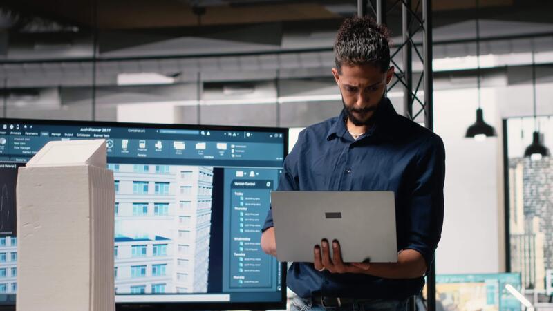 Male developer evaluating architectural 3D models and plans to find measurements and zoning regulations, collecting construction site and layout details in the office. Camera B. Pro Video