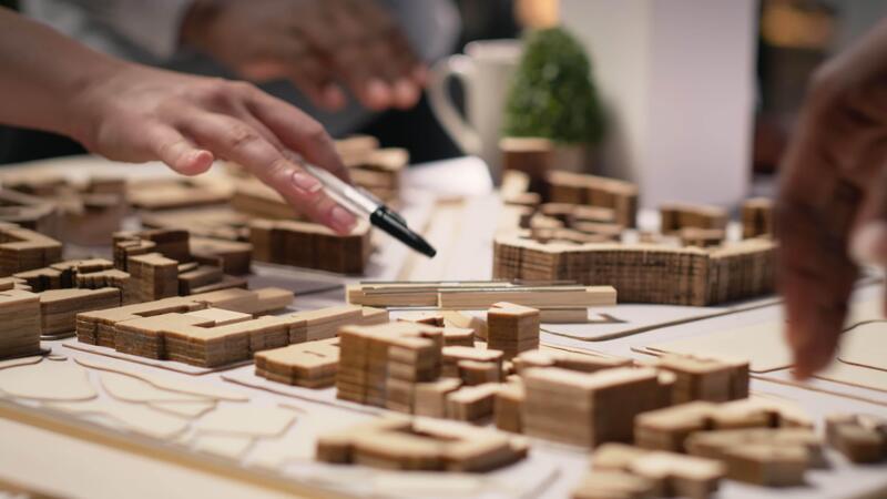 Close up of developers work together on layout city planning initiative with residential project for infrastructure growth, experts using 3D models for site preparation. Master plan. Camera B. Pro Video