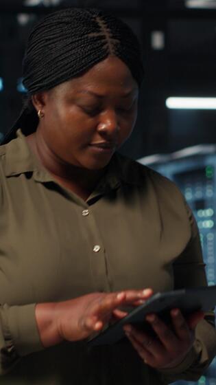Vertical Data center employee using tablet to manage software updates for system stability. African american engineer in server room configuring infrastructure with device for optimum performance, camera B Pro Video