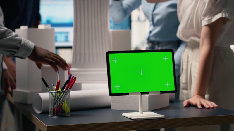 Real estate developers work together using architectural models and copy space, designing a sustainable residential project aligned with zoning regulations and property investment trends. Camera B. Pro Video