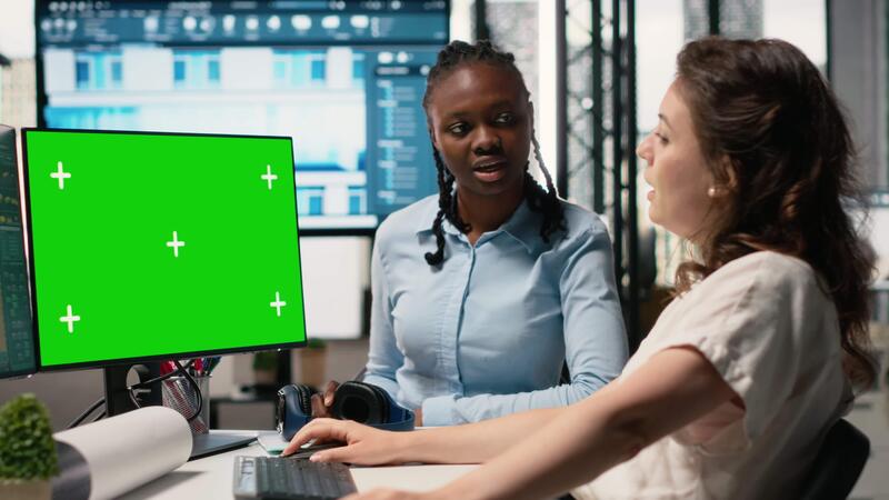 Developers team planning construction with software tools and green screen, reviewing project layouts, zoning requirements and property development strategies for real estate growth. Camera B. Pro Video