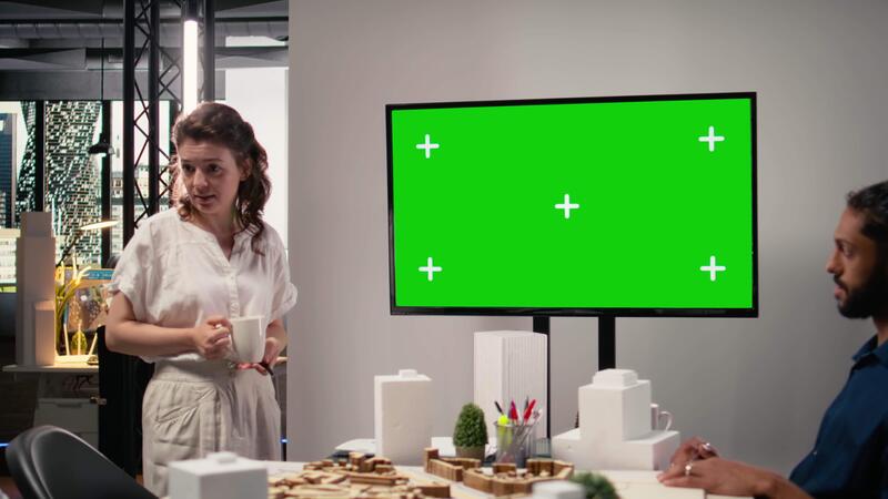Diverse team exploring zoning regulations next to isolated display, meeting for city planning strategies with architectural 3D models and design tools for site preparation and development. Camera A. Pro Video