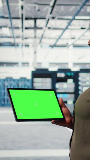 Vertical Server room admin uses isolated screen tablet to increase supercomputers workload capacity. Data center worker configures gear with chroma key device notebook, improving processing speed, camera A Pro Video