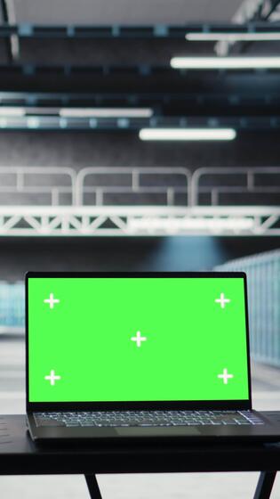 Vertical Isolated screen laptop in data center used for doing maintenance on infrastructure, improving workload. Chroma key notebook in server farm used by high tech server clusters for parallel processing Pro Video