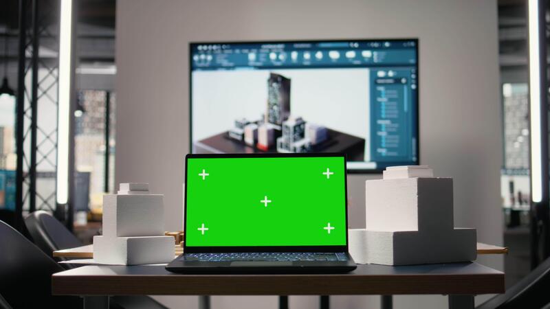 Empty architectural office designed for real estate with a green screen on pc, displaying blueprints, structural layouts and 3D building models used for planning residential projects. Pro Video
