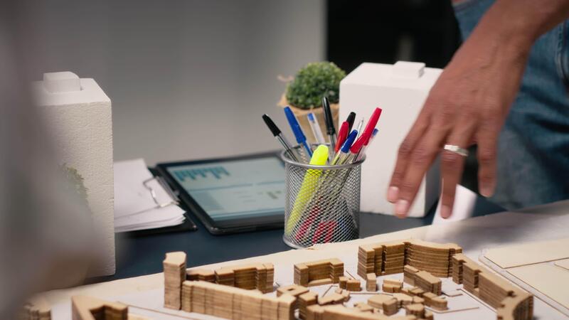Close up of engineers team creating the property layout for site preparation, using 3D models for urban development and construction project. Infrastructure growth and city planning. Camera B. Pro Video