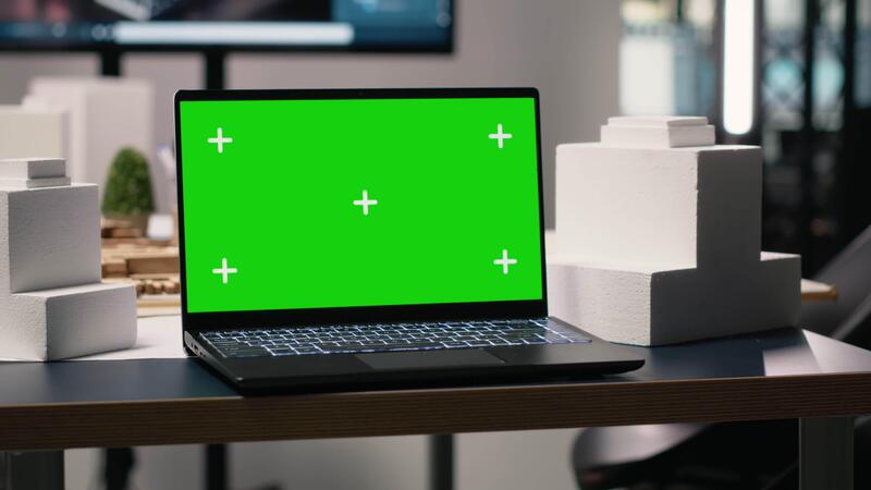 Clean workspace designed for property development with green screen laptop, showcasing empty meeting area with blueprints, 3D models and digital planning tools used for smart city projects. Pro Video