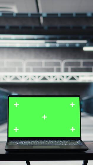 Vertical Green screen laptop in high tech data center facility with multiple rows of fully operational server racks. Mockup notebook used to oversee server hub built for digital storage systems Pro Video