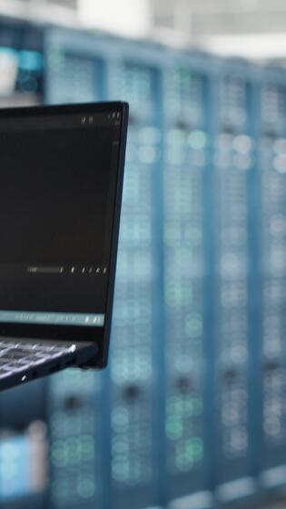 Vertical Data center engineer doing AI data analysis on laptop to upgrade infrastructure. Server room worker using notebook to manage storage systems for machine learning training datasets Pro Video