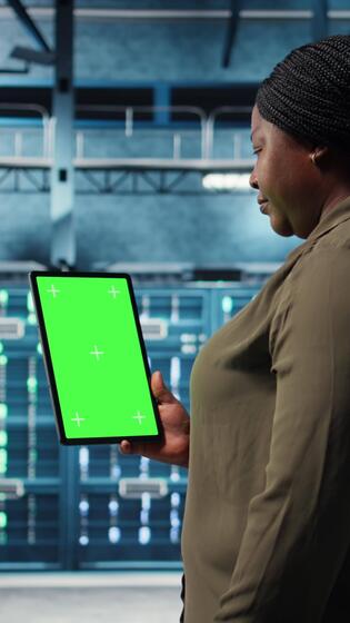 Vertical Software developer at work using green screen tablet in data center to check hardware for system stability. African american woman using chroma key device to oversee server farm, camera A Pro Video