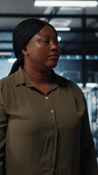 Vertical Software developer walking in data center, checking hardware for system stability. System administrator overseeing server farm room, monitoring infrastructure rigs, camera B Pro Video