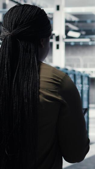 Vertical Developer doing data center automation using AI neural networks on tablet. Server room IT professional implements deep learning driven predictive maintenance systems using device, camera A Pro Video