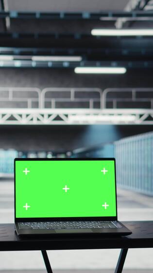 Vertical Green screen laptop used to do yearly checkup to prolong data center electronics life span and avoid downtime. Mockup notebook in server room monitoring infrastructure rigs, preventing crashes Pro Video