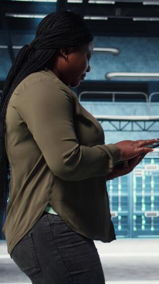 Vertical Smiling data center technician using tablet to manage software updates for system stability. Upbeat IT expert in server room configuring infrastructure with device for optimum performance, camera A Pro Video