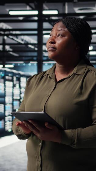 Vertical Admin in high tech data center using tablet to coordinate deployment of new server architecture. Server hub employee using device to do rollout of cybersecurity framework, protecting data, camera A Pro Video