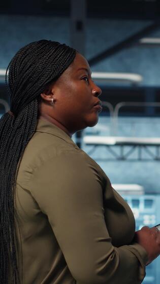 Vertical Smiling data center technician using tablet to manage software updates for system stability. Upbeat IT expert in server room configuring infrastructure with device for optimum performance, camera B Pro Video