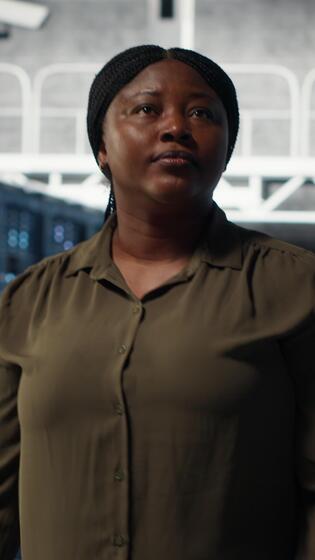 Vertical System administrator walking through data center server rows, implementing advanced cooling and power management solutions. IT specialist overseeing server hub, reducing energy consumption, camera B Pro Video