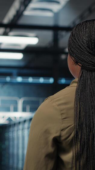 Vertical High tech data center technician uses tablet to develop disaster recovery plans, minimizing downtime. IT employee walking in server room, enhancing data protection protocols using device, camera B Pro Video