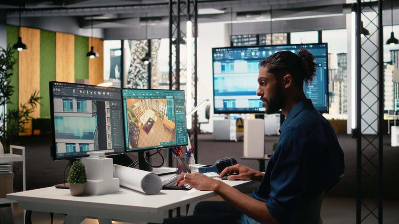 Middle eastern male developer creating property layout with furniture and other structure details, interior design on computer. Working on redevelopment for a residential construction. Camera A. Pro Video