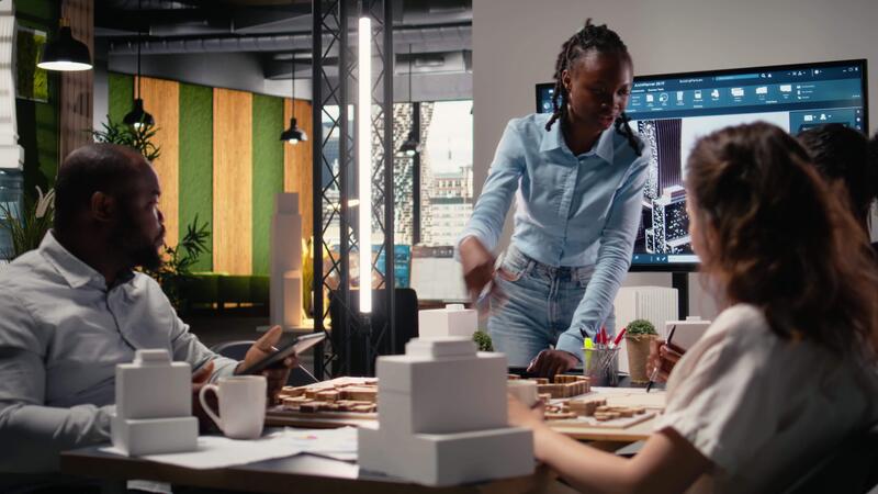 Multiethnic architecture developers using 3D models in brainstorming meeting, shows architectural software to work on structural city planning. Residential project for urban development. Camera A. Pro Video