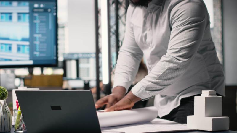 Black property engineer collecting construction details on blueprints sketch, planning session to respect zoning regulations and other layout rules. Site preparation for housing. Camera B. Pro Video