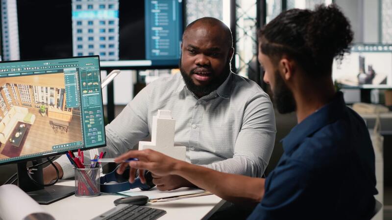 Diverse property developers managing construction floor plan and layout design on a software, urban real estate development. Analyzing building blueprints for housing project. Camera B. Pro Video