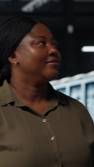 Vertical Supervisor in data center overseeing large scale IT equipment to maintain seamless operations. IT expert walking between server room rows, doing network management for increased uptime, camera B Pro Video