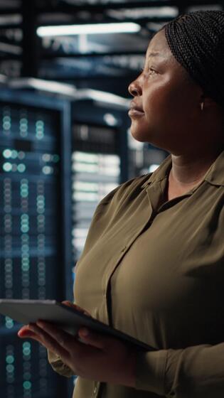 Vertical Data center software developer uses tablet to develop disaster recovery plans, minimizing downtime. IT worker in server hub enhancing data protection protocols using device, camera B close up Pro Video