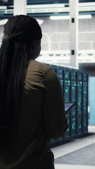 Vertical Data center technician using machine learning on tablet to optimize operations. IT specialist using device in server room with specialized gear accelerating complex AI calculations, camera A Pro Video
