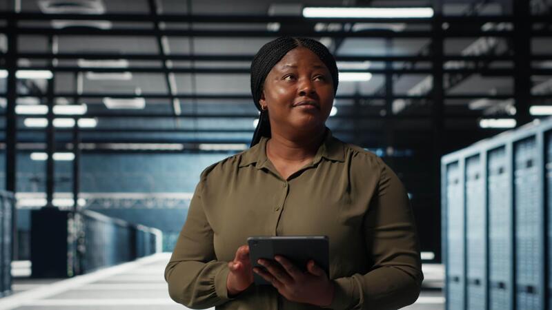 Data center software developer monitors data center metrics on tablet to enhance operational effectiveness. Woman in server room using app device analytics to predict performance, camera B Pro Video