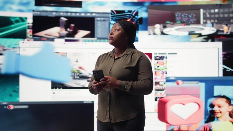 Woman using smartphone surrounded by curated recommendations while browsing streaming services. Person enjoying free time browsing favorite online clips on phone, camera A Pro Video