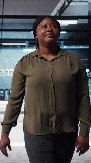 Vertical Supervisor in data center overseeing large scale IT equipment to maintain seamless operations. IT expert walking between server room rows, doing network management for increased uptime, camera A Pro Video