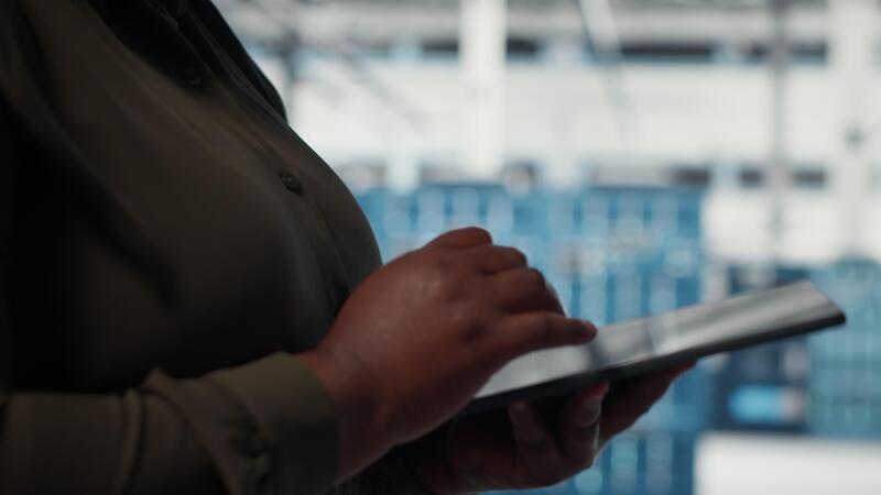 Close up of data center software developer doing data analysis on tablet to upgrade infrastructure. Manager in server room using device to manage storage infrastructure datasets Pro Video