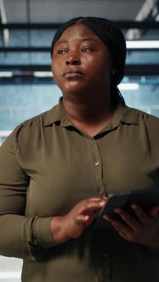 Vertical Data center engineer monitors data center metrics on tablet to enhance rigs operational effectiveness. Worker walks through server farm rows, using analytics on device to predict performance, camera B Pro Video