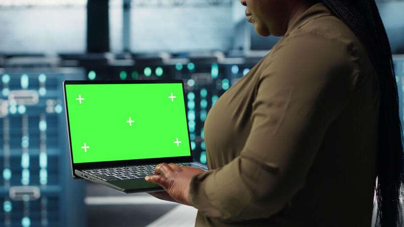 Programmer in data center using app on isolated screen laptop to ensure error free mainframes networks. Worker uses chroma key notebook to monitor server hub gear parts for failures, camera B Pro Video