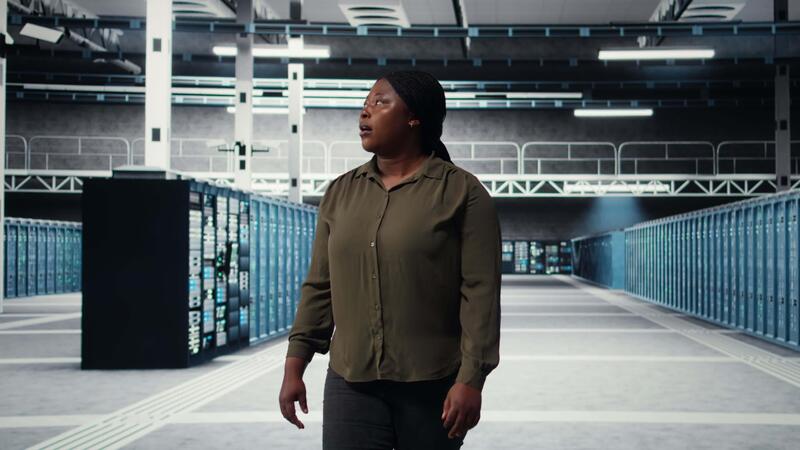 Admin walking in data center, overseeing large scale IT infrastructure to maintain seamless operations. Server farm employee doing network management for increased uptime, camera A Pro Video