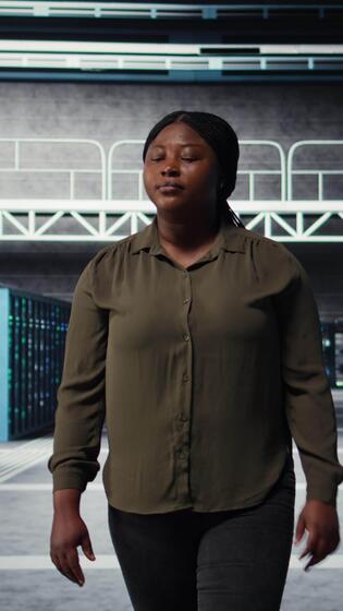 Vertical System administrator walking through data center server rows, implementing advanced cooling and power management solutions. IT specialist overseeing server hub, reducing energy consumption, camera A Pro Video