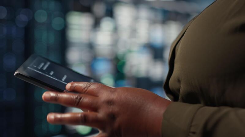 Programmer in data center using tablet to upgrade servers for increase in clients workload capacity. IT specialist in server farm configuring hardware rigs, improving data processing speed, camera B Pro Video