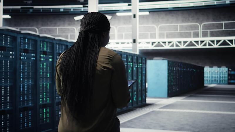 Data center technician using machine learning on tablet to optimize operations. IT specialist using device in server room with specialized gear accelerating complex AI calculations, camera A Pro Video