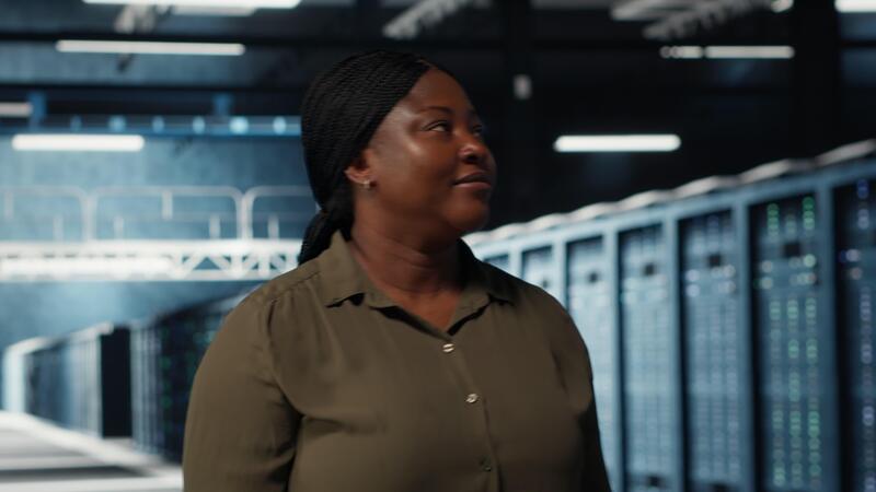 Supervisor in data center overseeing large scale IT equipment to maintain seamless operations. IT expert walking between server room rows, doing network management for increased uptime, camera B Pro Video