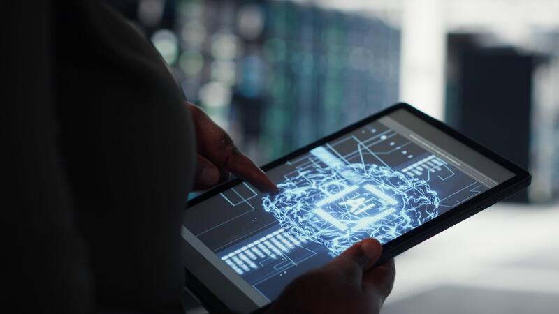 Close up of data center technician doing AI data analysis on tablet to upgrade infrastructure. Server room employee using device to manage storage systems for machine learning training datasets Pro Video