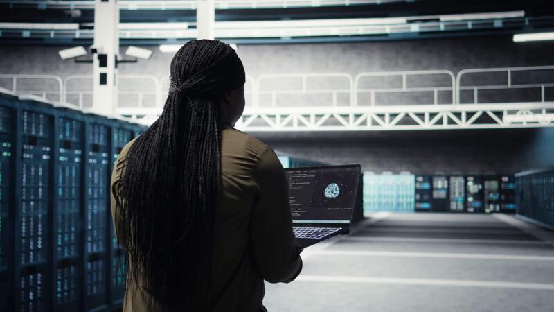 Engineer in server hub using laptop to upgrade rigs for increase in workload capacity using AI deep learning. Data center employee uses artificial intelligence to improve processing speed, camera A Pro Video